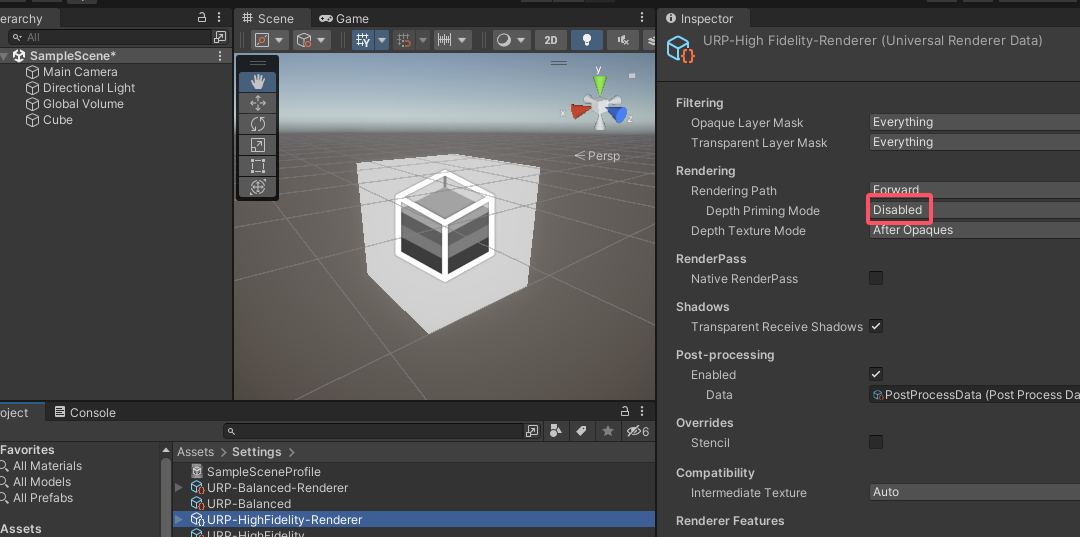 在Edit->ProjectSetting->Graphics 中使用的是URP-HighFidelity,其渲染器URP-HighFidelity-Renderer默认勾选了Depth Priming Mode(用于优化深度剔除的),需要设置为Disabled,不然我们写的材质可能会导致物体透明